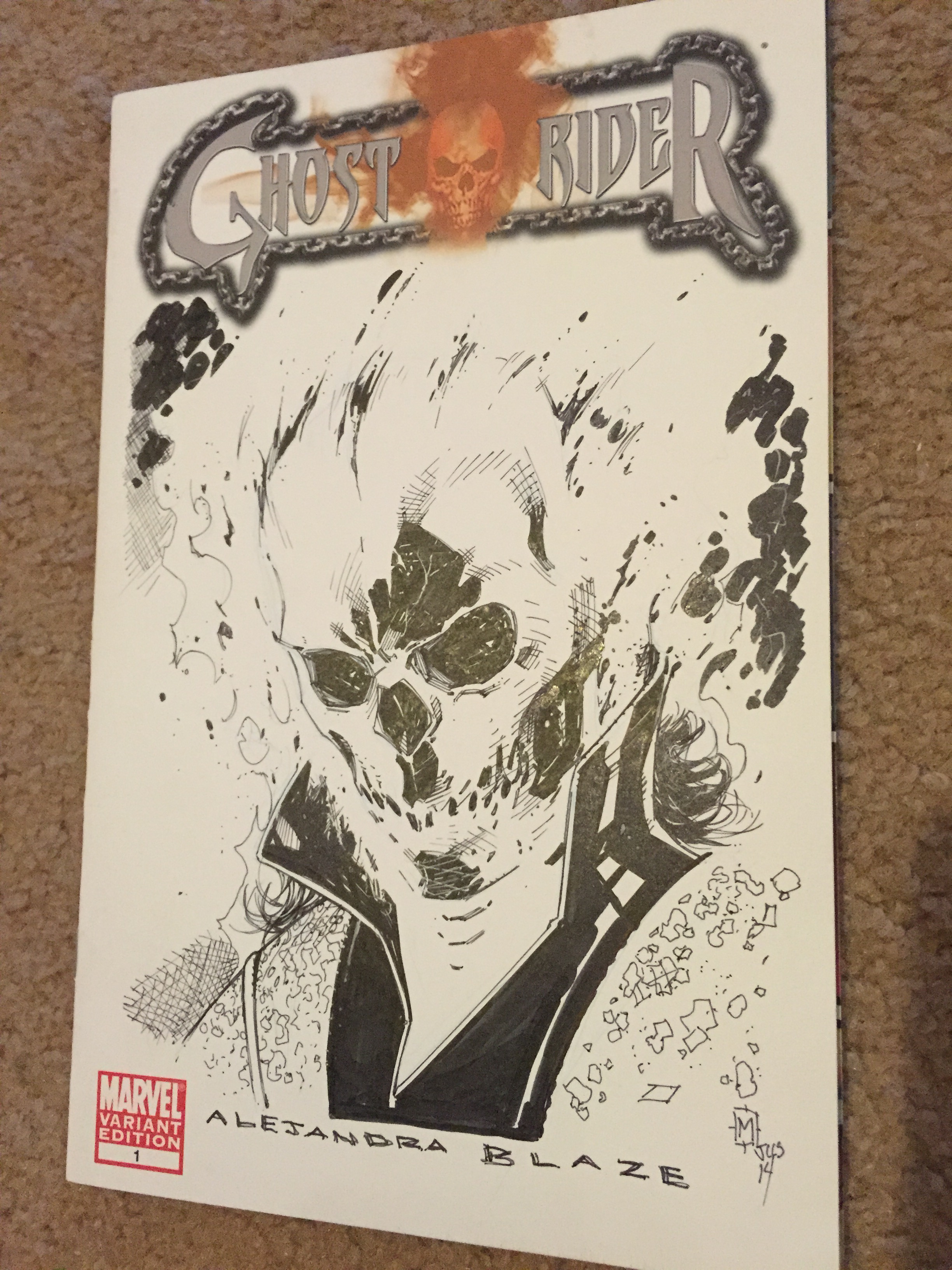 This sketch of Alejandra Blaze of Ghostrider was done by Matthew Clark at Jet City Comic Con. I think this was $50, but it could have been as low as $40, which is often the standard price. At either price it was an amazing value with the amount od detail and shading that was done, much more so than you see with many sketches that use formulas to construct figures. This was why his “full body” sketches were more, but this was a real incredible image.
