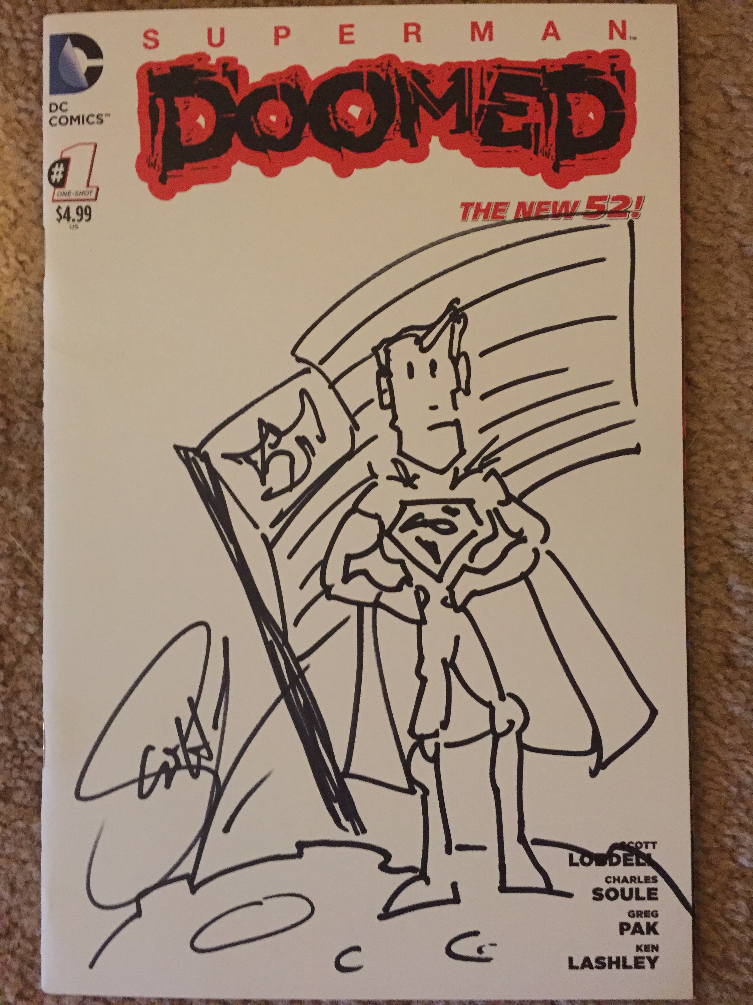 Many people don’t think this is a “real sketch” since it wasn’t really done by a comics artist and it was FREE. This was done really quickly by Scott Lobdell just out of fun, and it is one of my more treasured sketches because of it. Lobdell is a writer and not an artist, whose work on Superman Doomed was highly acclaimed in 2014. He did this quickly in under a minute and it was superman on the moon. This was also done at Rose City Comic Con 2014.