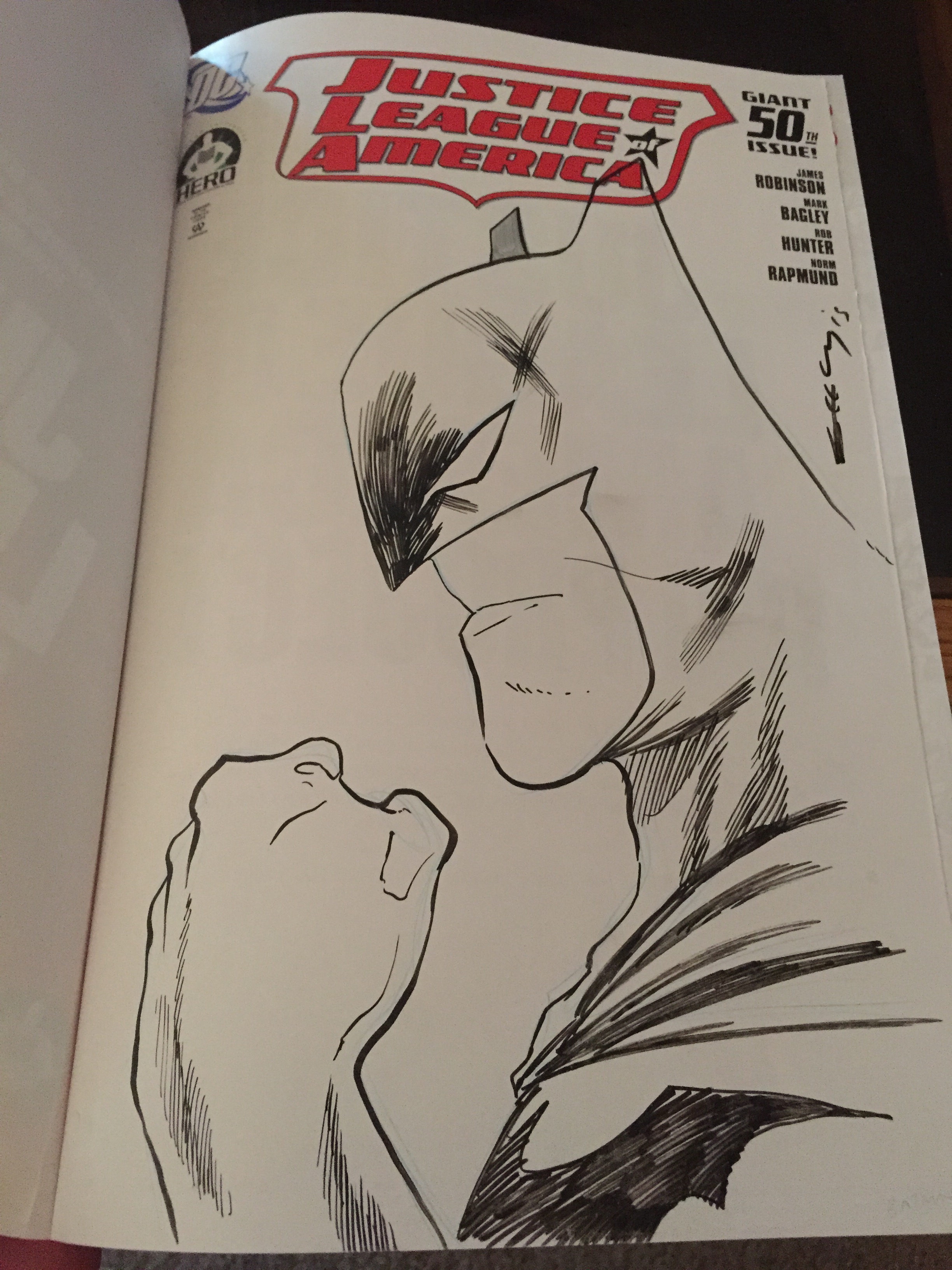 This sketch also came from Tim Seeley, and I had him do the sketch in the Justice League of America 100 Project from The Hero Foundation, which he did a cover in. Here you will notice a little less detail in it. He had some pens run out and so it was a little less detailed, so he only ended up charging me $20 for this sketch of Batman. Great deal! Chrissie Zullo also signed the book in just the page next to it.