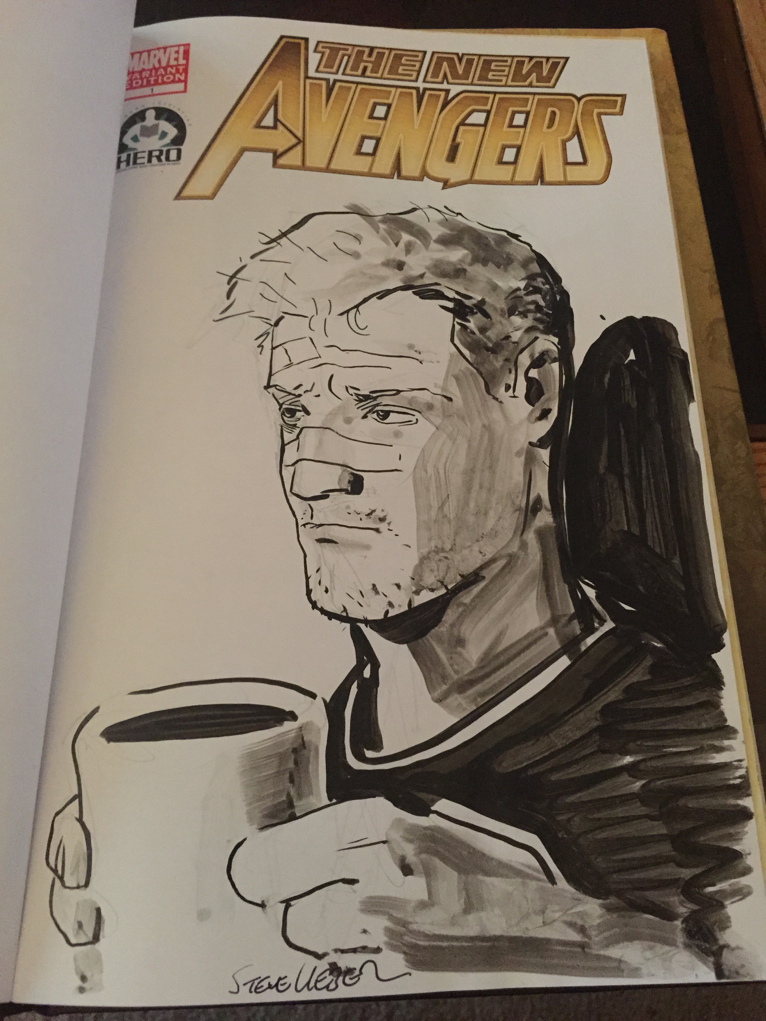 This sketch is of Cliff Barton, Hawkeye from the self-titled Matt Fraction series, done by Hawkeye artist Steve Lieber. He gave me an option of a sketch specifically of Hawkeye or Cliff, of which I chose Cliff. This $40 sketch was again a head only as full body was much more, but with the water-color pen shading it was a great choice. I also got this sketch done in the Avengers 100 Project book, in which he did a cover.