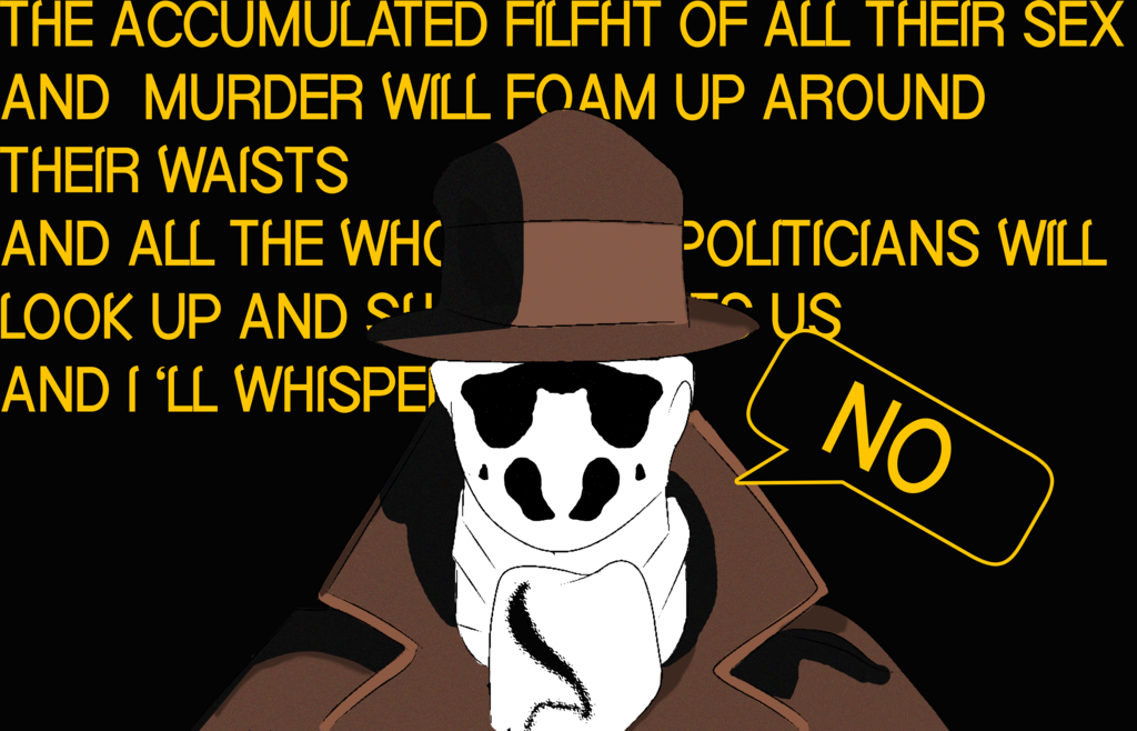 What we start off in the Watchmen is a number of textual objects that exist in the background, which is only indicating that they are not of primary story importance. This can come in the form of the text on a sign carried by Walter Joseph Kovacs or the text that has been spray painted along a brick wall. All of these exist as part of the world conveyed by image, but they build upon our textual understanding by giving us this type of communication inside their story space. The text as we read it does not exist inside their story space as they do not have the ability to visually see their dialogue or thoughts, but they do have the ability to read these textual moments. This is solidified by the inclusion of Rorschach’s journal as a main narrative feature that, though no characters actually read, still exists in the story space (This is legitimized when it is sent to the New Frontiersman, but then remained privileged to the audience when it is rejected for publication.) What this does is create a second level of commentary where reading text that exists within their personal context becomes part of the way we understand the characters and the story.